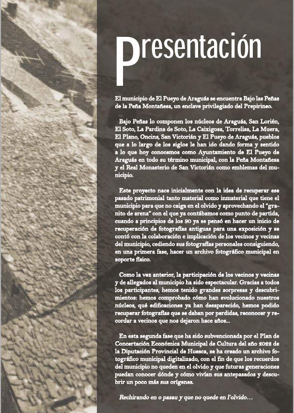 El Ayuntamiento de El Pueyo de Araguás ha realizado el proyecto Recopilación, archivo fotográfico municipal y exposición fotográfica financiado por la Diputación Provincial de Huesca dentro de la convocatoria del Plan de Concertación Económica Municipal de Cultura del año 2022.